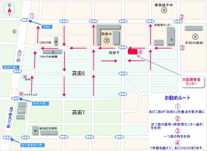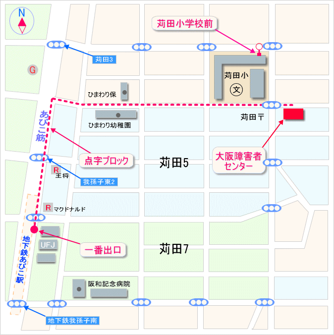 地下鉄「あびこ駅」1番出口より点字ブロックを辿って行くと「大阪障害者センター」に着きます。